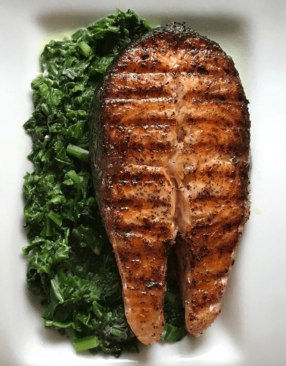 Сьомгу маринуємо в травах, солі, перці, трішки соку лимона. Смажимо на сковороді без масла, так як вона жирна і сама у «власному соку» прекрасно приготується.